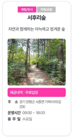 정원같은 숲 서후리숲은 30만평의 사유림중 10만평에 자연 그대로를 느낄수 있는 산책로입니다. 중부지방에 서식하는 모든 동 식물들과 계곡의 물고기들이 있으며 그 중에 몇 종류의 나무들은
