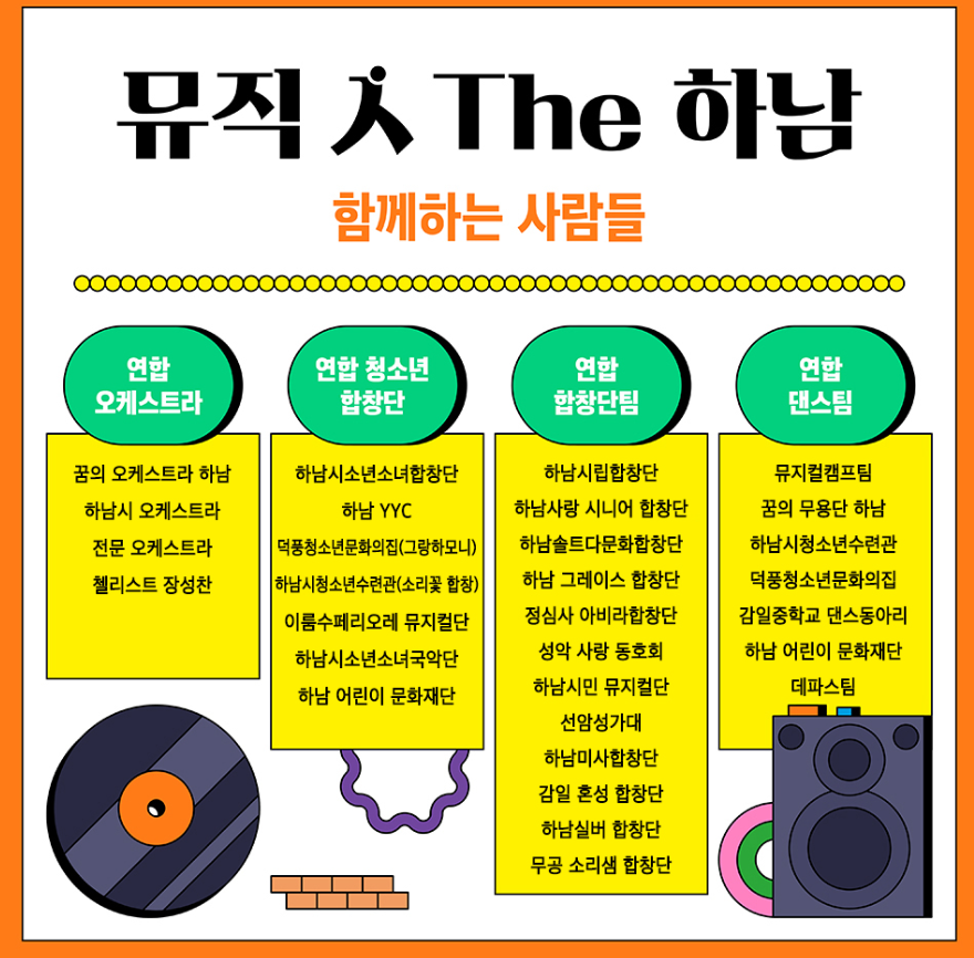 하남시에서 활동 중인 오케스트라, 합창단, 뮤지컬단, 음악동호회 회원들이 출연하며 유명 뮤직배우와 가수들이 함께 합니다. 작년도 출연한 이건명 배우를 비롯하여 김소현 & 손준호부부, 최정원, 최정상급 디바 이은미, 진또배기 이찬원이 열기를 불어넣을 예정입니다.
